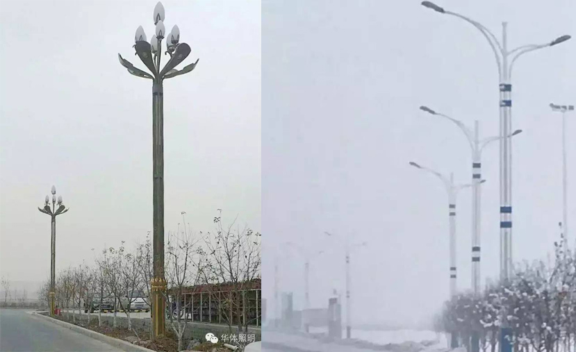 12月的石城已是零下10度左右,大雪紛飛,銀裝素裹。調(diào)皮的雪花輕輕地落在含笑燈上,一夜之間,含笑像是穿上了一件雪白的禮服,高雅端莊。遠看好似一位優(yōu)雅的女子,飽含深情地望著遠方,像是在等待遠歸的愛人。10米雙臂路燈,以藍白為主要色調(diào),給人以干凈、利落之感。燈桿中部配置LED七彩燈條,為這雪白的王國增添五彩繽紛的樂趣。