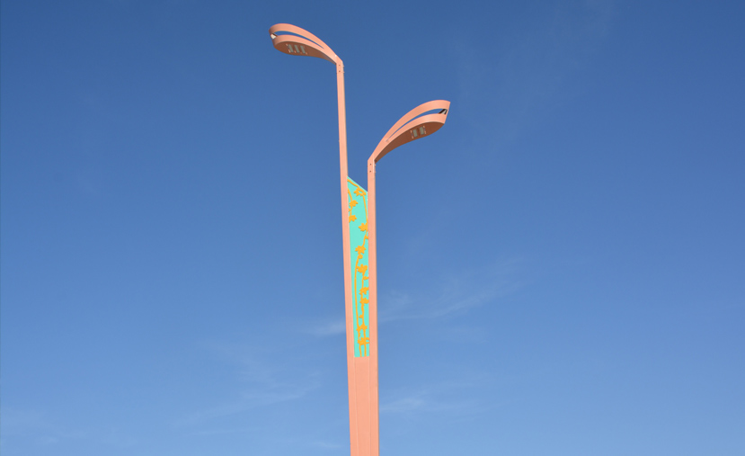 夜幕降臨,魔方燈陣通過預(yù)設(shè)的光效變換模式,開始了絢麗的表演秀,時而忽快,時而忽慢;時而交相輝映,時而如夢如幻,為哈密的夜空增添絢麗的色彩,為當(dāng)?shù)厥忻癯尸F(xiàn)一場燈光的視覺盛宴。梧桐絮語,燈高10m,運用玉蘭燈頭,輔之以鏤空的梧桐剪影,流暢的線條,V型的桿體,帶來強烈的視覺沖擊。該燈主照明光源采用LED,裝飾光源位于梧桐剪影的下方,每當(dāng)夜幕降臨燈光開啟,婆娑的梧桐樹影便活潑生動的展示出來。