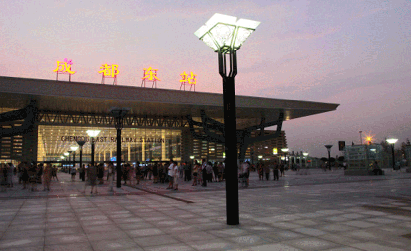 成都東站使用的是景觀燈“耀”。該景觀燈時(shí)尚、大氣而又具有復(fù)古氣息。