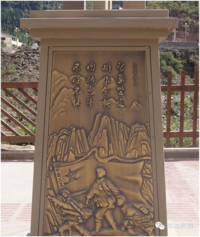燈體底座采用了紅色文化設(shè)計元素,進行銅板雕刻紅軍抗戰(zhàn)形態(tài),燈底長城紋理表面更具歷史厚重感。整燈玉蘭花的植物造型呼應(yīng)該城生態(tài)化特征主題,為“景城一體”的目標(biāo)出力。