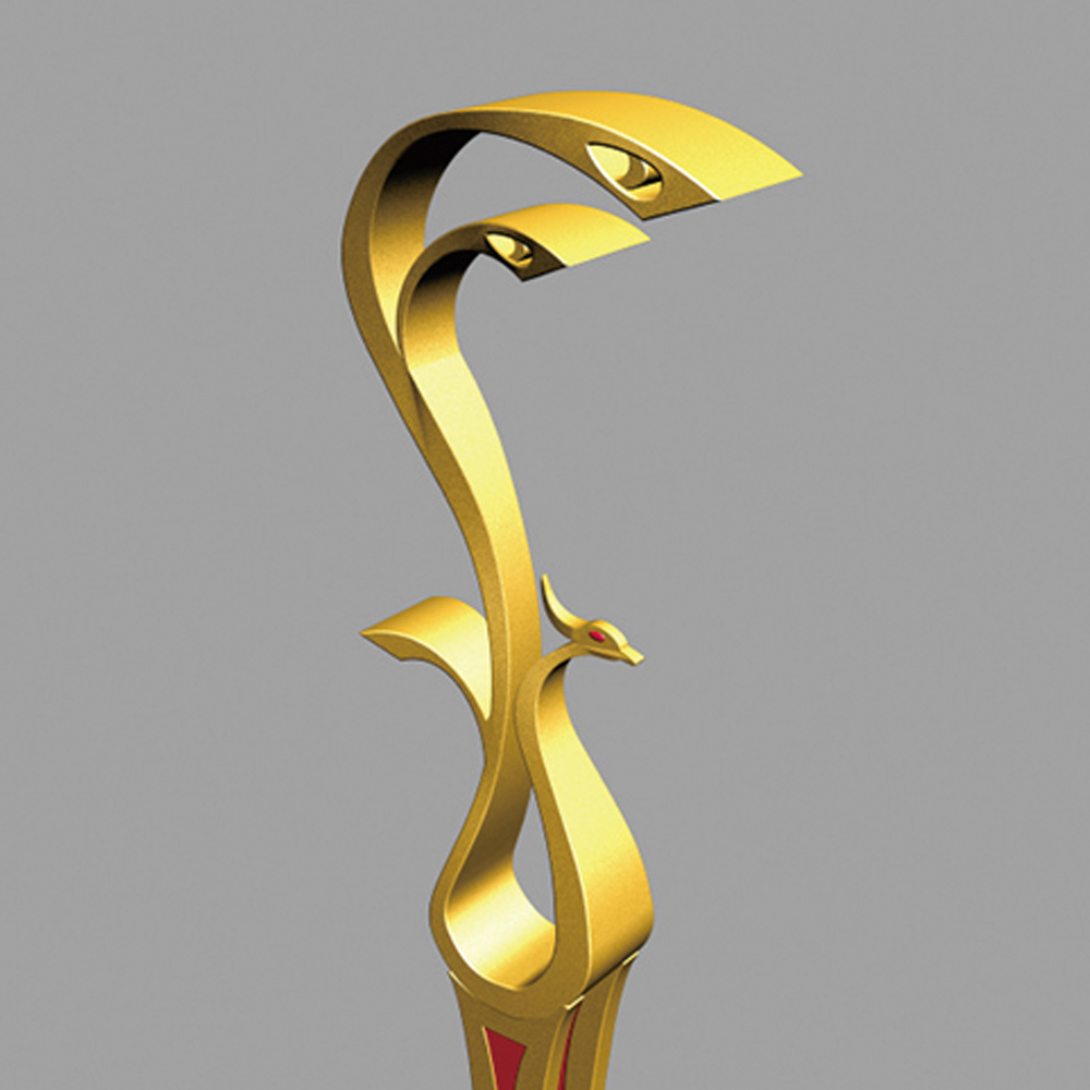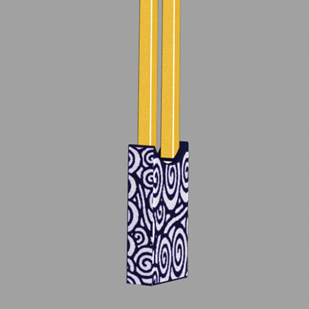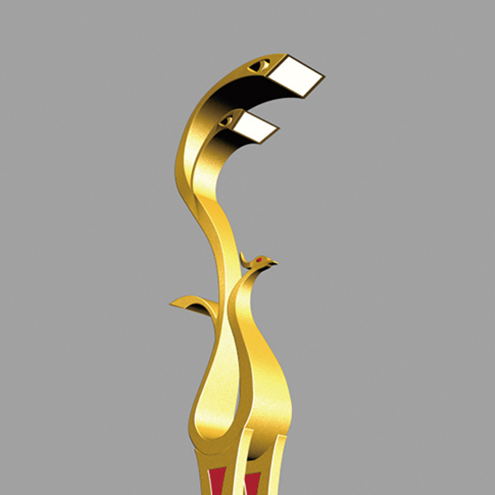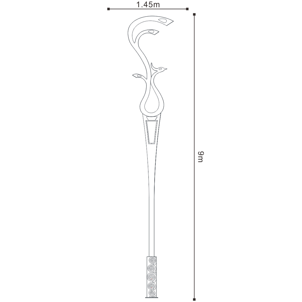 燈型上部為鳳凰的流線簡(jiǎn)化樣式,桿體采用夸張的手法表現(xiàn)鳳凰的腳腿,底座用強(qiáng)烈的對(duì)比方式,以藍(lán)、白相間的“祥云”紋飾來表現(xiàn)鳳舞九天的藝術(shù)效果;