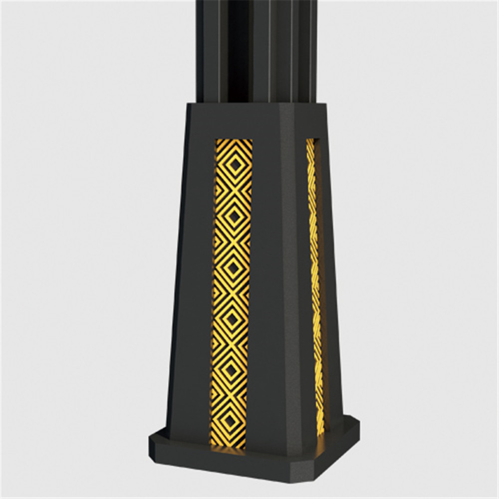 設(shè)計(jì)以秦漢建筑為元素,取秦代崇尚的黑色為主色調(diào),燈臂裝飾以秦代紋飾,造型則提取自漢斗、漢闕。線條流暢、簡(jiǎn)練,四向?qū)ΨQ的造型莊重大氣。