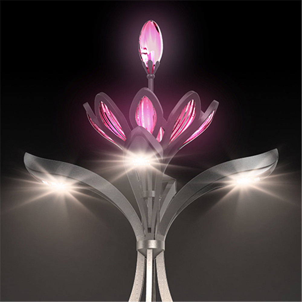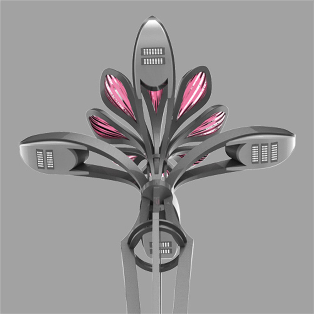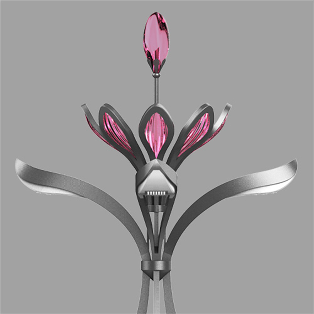 采用山茶花作為設(shè)計(jì)元素,燈桿設(shè)計(jì)成四桿花瓶狀,打破常規(guī)燈桿單一的樣式,主體分為功能照明和裝飾照明兩個(gè)部分,分別對(duì)應(yīng)的是山茶花的葉子、花瓣和花蕾,彩色的裝飾玻罩白天具備一定景觀性,和道路綠化景觀的“四季有花賞”的設(shè)計(jì)策略相融合,夜晚呈現(xiàn)山茶花盛世開放的亮麗景致。